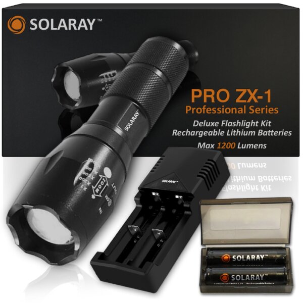 - 1 x ZX-1 LED Flashlight with 5 Mode Settings (High, Medium, Low, Flash Strobe, S.O.S. Strobe), ~1,200 Lumen output, and an attached lanyard.